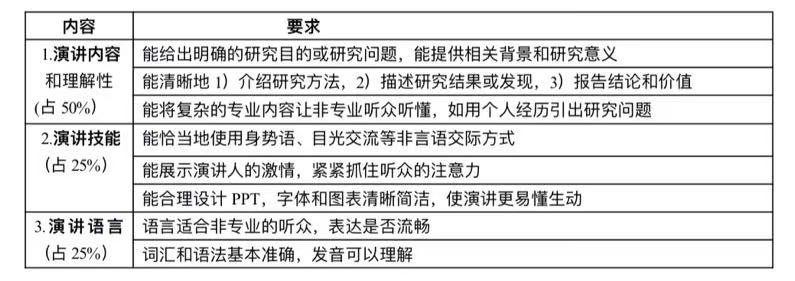 2.英语演讲视频。演讲作品基于用英语撰写的研究报告或研究计划。要求团队推选一名成员用易于理解的英语、在5分钟内向没有专业背景的听众介绍自己的研究。演讲要求录制成5分钟视频(误差不超过1分钟),评分标准见表1。