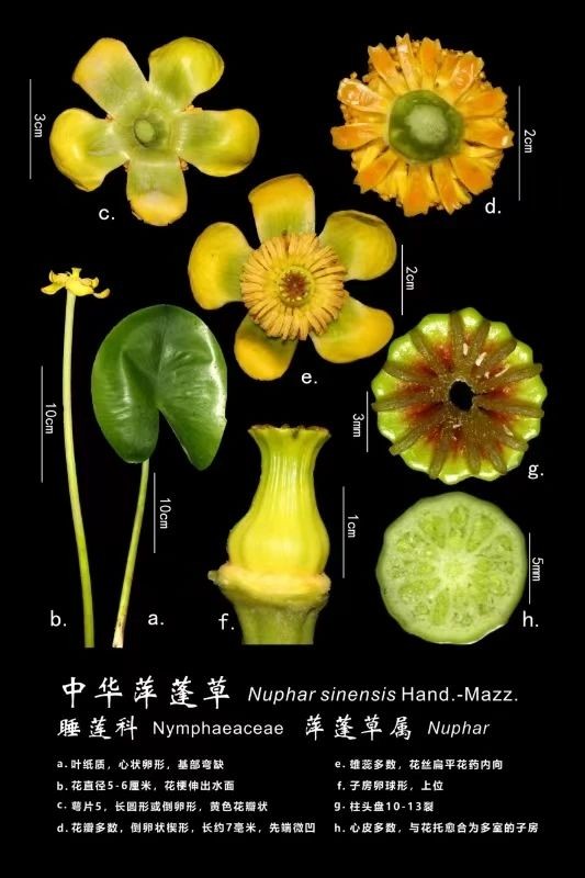 (1)材料1【5张以内高清解剖照片(显微/宏观结合),需准确标注:植物名称(中文名+拉丁学名,如中华萍蓬草(Nuphar pumila subsp. sinensis (Handel-Mazzetti) D. Padgett);形态学描述,如:a.叶纸质,心状卵形,基部弯缺;b.花直径5-6厘米,花伸出水面;c.萼片5,长回形或倒卵形,黄色花瓣状;d.花瓣多数,倒卵状楔形,长约7毫米,先端微凹;e.雄蕊多数,花丝肩平花药内向;f.子房卵球形,上位;g.柱头盘10-13裂;h.心皮多数,与花托愈合为多室的子房】;