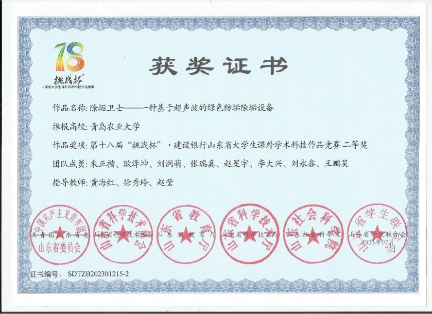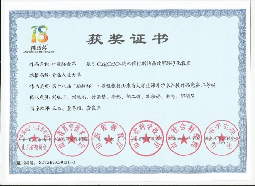 由共青团山东省委、山东省科学技术协会、山东省教育厅、山东省科学技术厅、山东省社会科公司、山东省员工联合会主办的第十八届“挑战杯”·建设银行山东省老员工课外学术科技作品竞赛决赛落下帷幕。ladbrokes立博化学与药公司两支队伍荣获大赛二等奖,分别是由黄海红、徐秀玲、赵莹老师指导的《除垢卫士——一种基于超声波的绿色防垢除垢设备》和由王杰、董冬旗、龚良玉老师指导的《打败醛世界——基于Cu@Co3O4纳米催化剂的高效甲醛净化装置》。