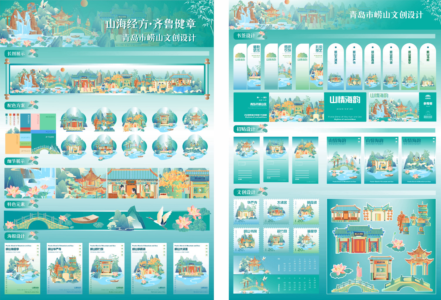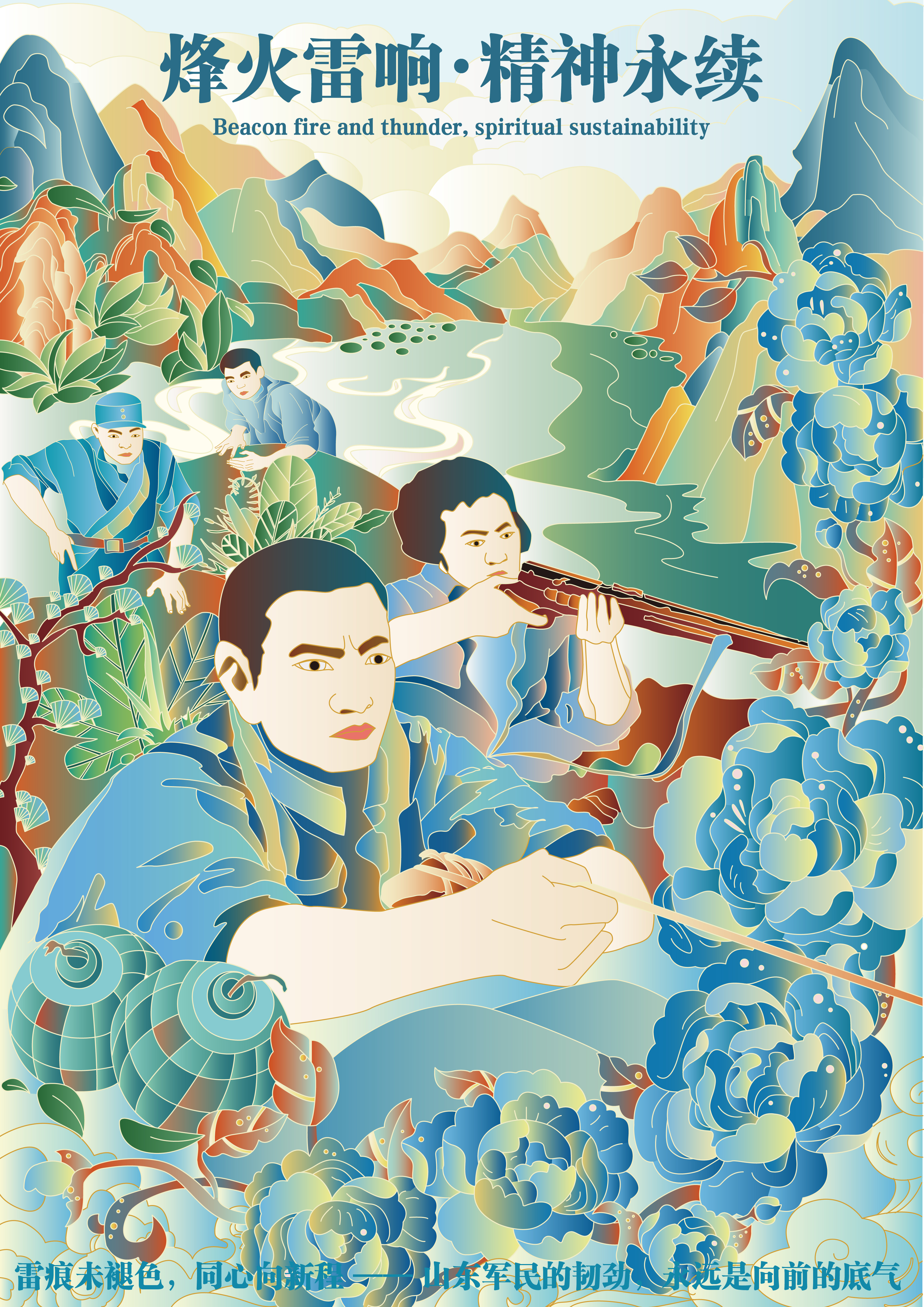 本次大赛由山东省市场监督管理局联合省委宣传部、省委网信办、省教育厅等多部门共同主办,以“讲好山东故事·传递时代强音”为主题,共征集作品3462件,最终评选出获奖作品305件。邵子悦、张鹏宇同学创作的《山海经方·齐鲁健章》,以崂山“海上仙山”为灵感,融合标志性建筑与自然元素,通过清新青绿色调与多元文创载体,展现“共建共享、全民健康”的主题;崔嘉嘉、陈奕安、马成龙、张继平、殷其博同学共同创作的《烽火雷响·精神永续》,以海阳地雷战为创作背景,运用现代插画语言还原抗战时期的历史场景,描绘军民同心的抗战群像,表达了革命精神的永恒传承。两件作品以鲜活的创意表达与艺术感染力从众多参赛作品中脱颖而出。