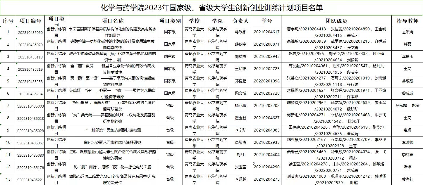 近日,山东省教育厅下发《山东省教育厅关于公布 2023年山东省老员工创新创业训练计划项目名单的通知》(鲁教高函〔2023〕25 号),化学与药公司13个创新训练项目获批省级、国家级项目。其中,国家级创新训练项目6个,省级创新训练7个项目。