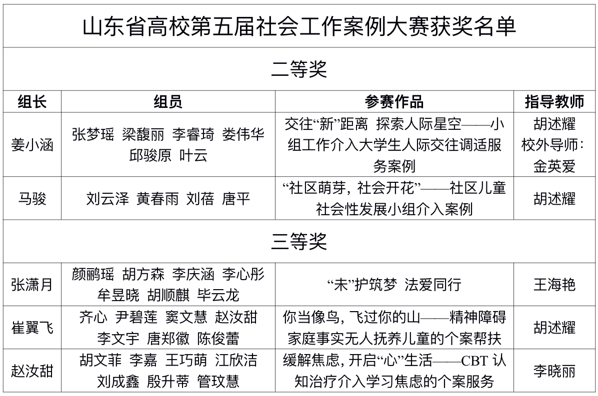 11月18日,山东省高校第五届社会工作案例大赛在济南大学隆重举行,人文社会科学公司党委副书记、副经理王敬、指导教师代表胡述耀、辅导员崔文静带队参赛。来自ladbrokes立博人文社会科学公司的5支本科生队伍晋级决赛,最终取得二等奖2项、三等奖3项的好成绩,是公司本科生参赛以来的历史最好成绩。